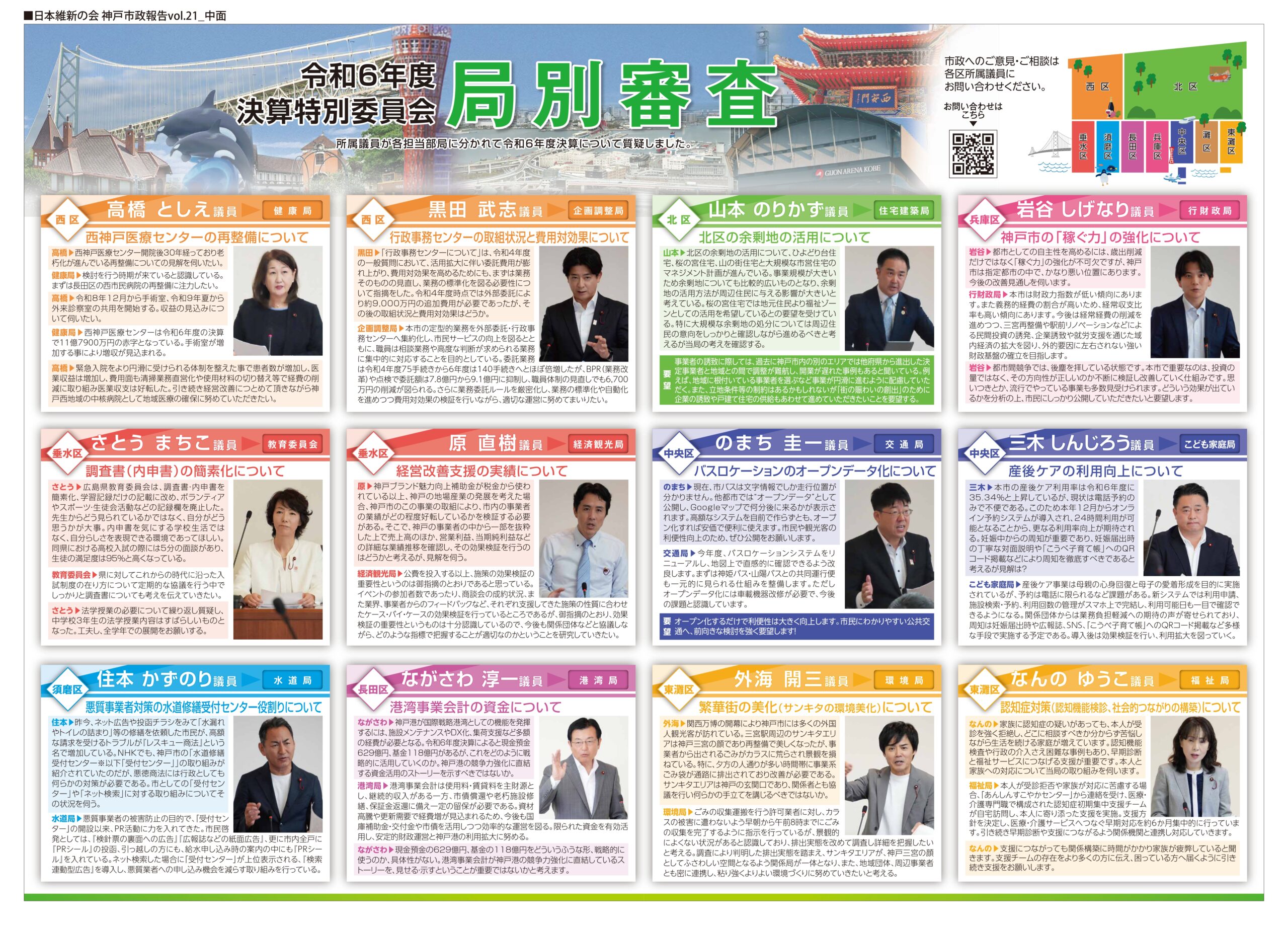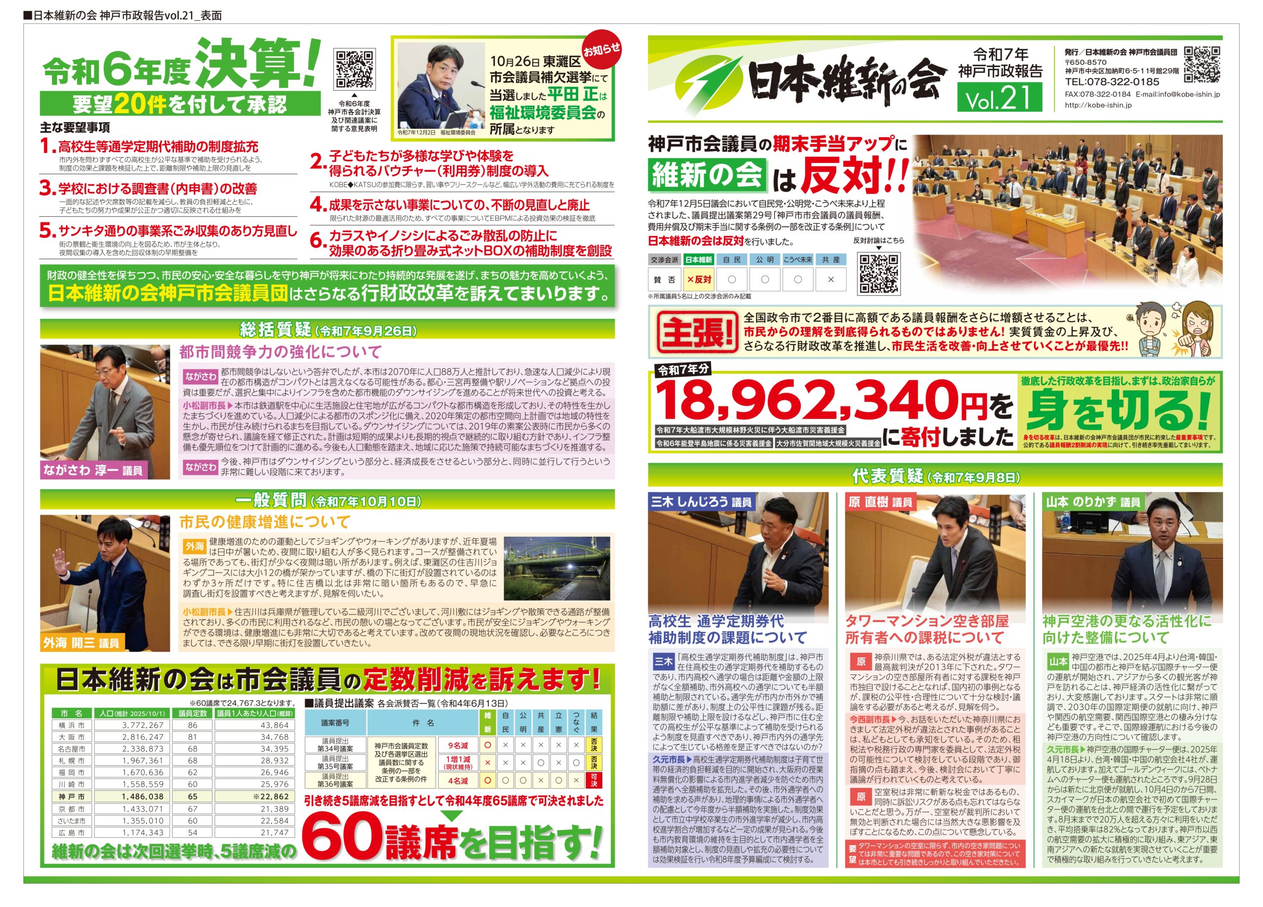 お知らせ 2025年「日本維新の会通信 Vol.21」を発行いたしました お知らせ2025.12.17 日本維新の会 神戸市会議員団は、期末手当の増額の条例に関して、反対討論を行いました。 また、令和6年度決算を質疑し、要望を付して承認を致しました。 詳細は、下記の日本維新の会通信をご参照下さい。 (画像をクリックしていただくと拡大されます。) <最近の記事へ 古い記事へ>